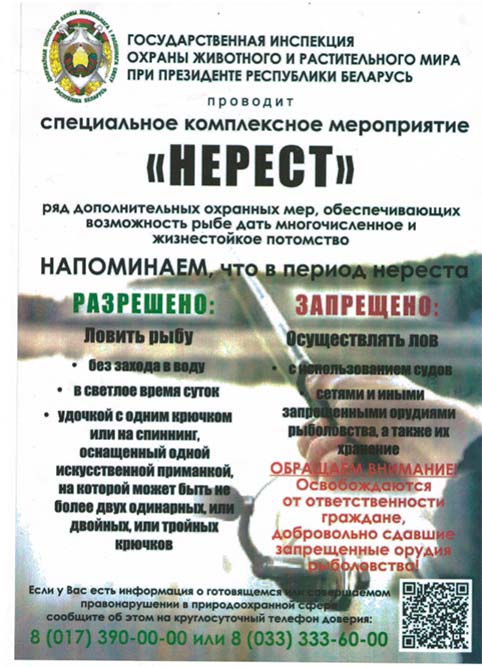 В связи с общим весенним запретом Государственной инспекцией охраны животного и растительного мира при Президенте Республики Беларусь в период с 16 марта по 8 июня 2026 года проводится специальное комплексное мероприятие «Нерест», основными задачами которого определены: